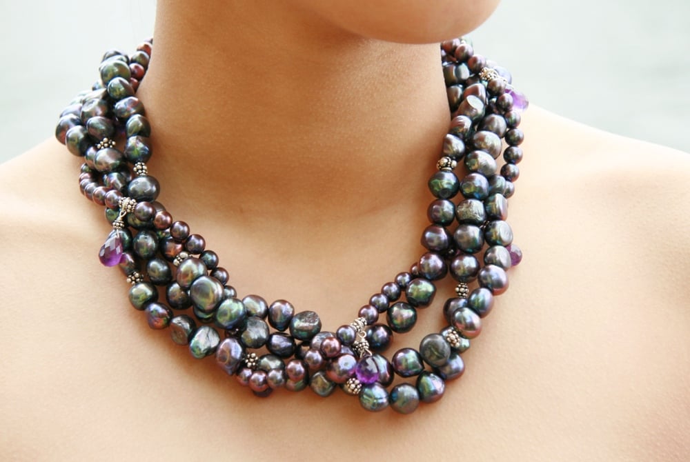 Multi-Strand Peacock Pearl and Amethyst Collar